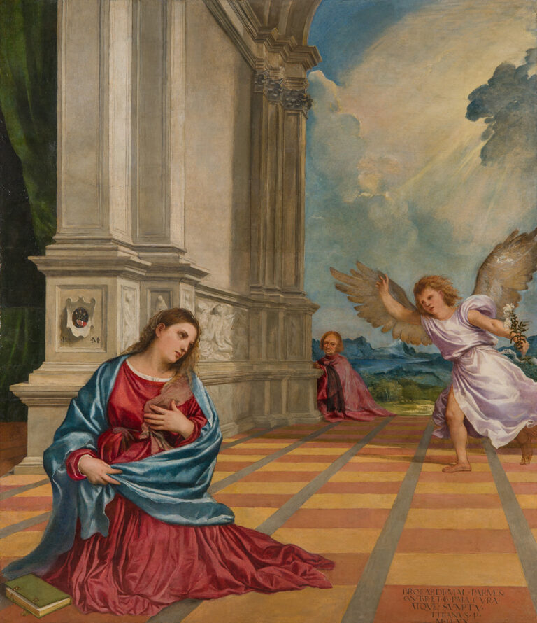 Titian’s Annunciation dates to 1520, just a few years after he finished his Assunta (1516-1518) for the high altar of the basilica dei Frari in Venice. The Annunciation testifies to Titian’s unique ability to transform and in fact revolutionize the structure of devotional art. As with the Madonna di Ca’ Pesaro (1519-1526), in the Treviso Annunciation, the artist experimented with asymmetrical space, classical architecture, light, and portraiture. Rather than conceiving a traditional depiction of the Annunciation with the angel Gabriel on the left, and the Virgin Mary on the right, Titian reshaped the iconography of the scene by placing the Virgin in the left foreground facing the viewer. The angel is seen hastily emerging from the right-center of the scene, as divine rays of sunshine break through the clouds in the upper right. It has been suggested that the cloud should be regarded as a symbol of the Virgin, and the sun emerging from it as a reference to the incarnation of Christ, the Sol splendidissimus. The composition was completed by Pordenone’s fresco of God the Father, who once descended from the dome above (unfortunately destroyed during World War II, in the air raid of 7 April 1944).