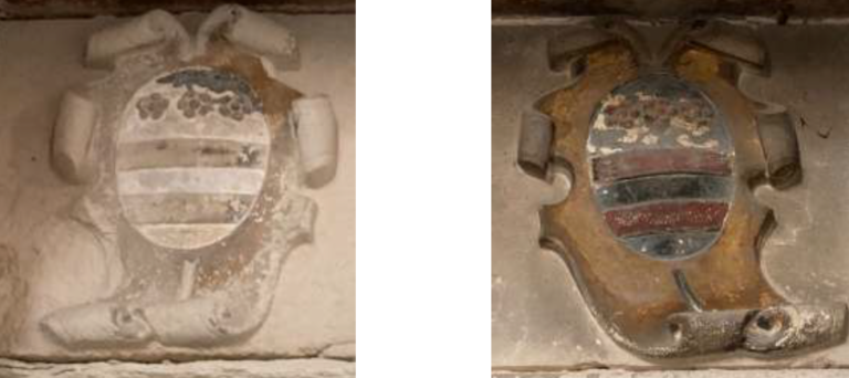 The Verona marble sarcophagus was in a reasonably well-preserved condition, although the surface was greatly obscured by dust and grime, with some signs of deterioration evident in the joint fills between the individual pieces. The two Donato coats of arms, made from a soft carved stone, suffered from the effect of long-term exposure to rising damp due to their proximity to the deteriorating stone portal underneath. Both shields had remnants of gilding and polychrome decoration, possibly dating back to their original creation, and this decoration was obscured by surface grime and lifting and flaking.