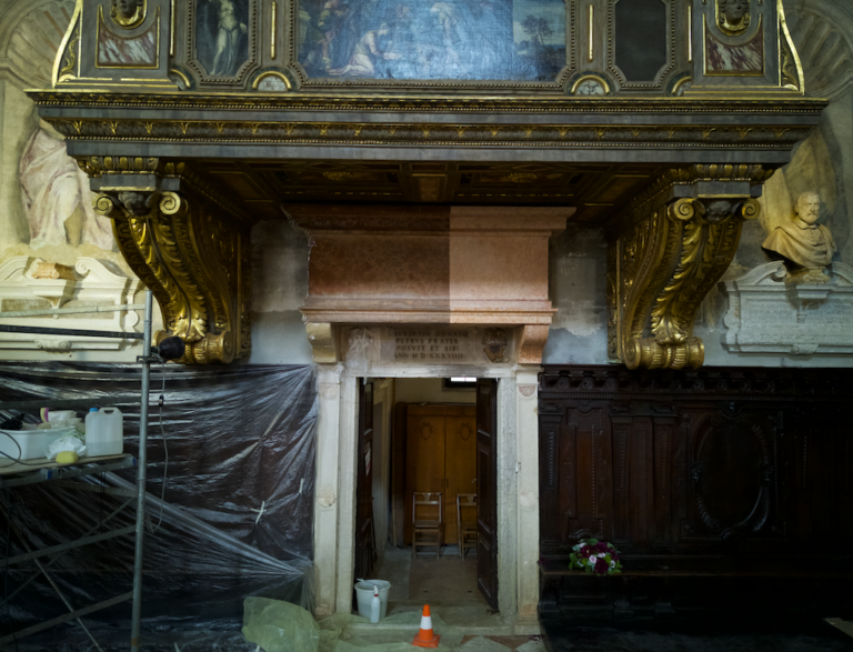 When building the organ between 1559 and 1569, Veronese also painted two monochrome canvases flanking the Donato Tomb, depicting two angels holding a skull and extinguished torches. The paintings are currently undergoing conservation treatment by Save Venice.