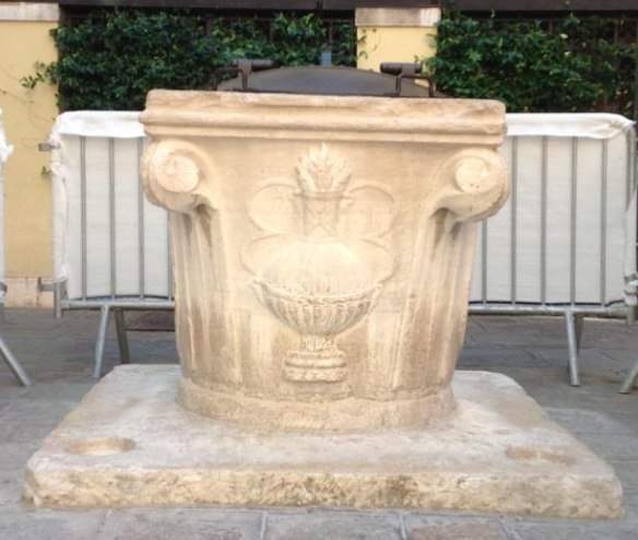 Before modern plumbing existed in Venice, the main source of fresh water came from cisterns that collected rain water, often in the center of the many public squares of Venice. The cisterns were topped with stone wellheads that were often decorated with floral motifs, religious symbols, and even family crests or emblems of the Venetian scuole, the powerful lay confraternities of the city. Wellheads were not only functional and useful, but also complimented the architecture and enhanced the aesthetic appeal of many of the campi of the city. They were also an artistic medium through which the government, the scuole, and members of the patriciate expressed their identity.
