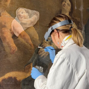 Many notable conservations are now underway in the conservation track of the WAV program, led by Melissa Conn. The most transformative thus far involve works by Giulia Lama (1681–1747). At the Scuola dei Mercanti in Cannaregio, conservators Enrica Colombini, Elisa Galante, and Sofia Marchesin continue to treat Lama’s canvases of the Four Evangelists from the church of San Marziale. These once dark and dingy paintings are now recognizable as some of the finest examples of the artist’s work. The conservation of Saints Mark, Luke, and John has been generously sponsored by an anonymous donor in Memory of Bernice F. Davidson. Saint Matthew has been generously sponsored by Donna Malin.